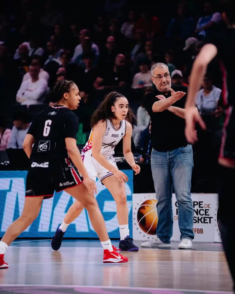 L’Accor Arena est impressionnante, même à 10h un samedi matin. Malgré ça, bon nombre des 20 000 sièges de la salle sont remplis et poussent tant bien que mal leur équipe. La musique résonne et la pression monte lorsque le show lumineux débute pour l’entrée des joueuses. « Les filles ont été happées par l’événement, l’extérieur et aussi Charleville » concédait David Girandière. Il est vrai que le début de match peut difficilement lui donner tort. Les Angevines se font subtiliser par trois fois le ballon et il faut attendre plus de deux minutes pour voir le premier panier angevin des mains de Cherry (2-5, 3’). Trop loin de leur vis-à-vis en défense, elles accusent déjà un retard de six points après un panier de l’intenable Eva Hamlil trouvée toute seule à trois points (4’). Les Angevines ont toutes les peines du monde à passer le premier rideau offensif adverse et Cherry peine à trouver des solutions de passe et doit perdre le ballon. Sur la récupération, Srdnovic bien trouvée en tête de raquette rajoute deux points supplémentaires, le coach angevin pose le premier temps mort de la partie, (4-12,6’). « On a pris le match par le bon bout, la consigne était de tuer le match rapidement » confirmait Hamlil. Le retour sur le parquet n’est pas plus glorieux. Toujours gênées par cette défense ultra-offensive, les Angevines trouvent néanmoins des solutions sur grand espace à l’image de Cherry (6 pts dans le premier quart) qui se fraie un chemin toute seule jusqu’au panier. Une initiative bien trop rare pour espérer mieux, en face la machine ardennaise ne s’enraie pas, bien au contraire et la capitaine Raimbault augmente l’écart à onze points après un shoot à trois points, (6-17,8’). Celle qui avait remporté déjà le trophée mais avec les seniors l’an passé récupère de nouveau un ballon et file au panier pour clôturer ce premier acte, 8-19.
